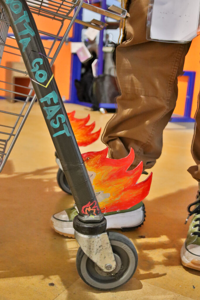 So entstand mein Rennwägeli. Ein Einkaufswagen, der genau auf meine Bedürfnisse abgestimmt ist. Natürlich mit Halterung für meine Krücken, einer Hupe, Fussablage, viel abnehmbare Polsterung und Körbchen für mein Chaos. Aber auch Front- und Backreflektoren, bewegliche Lichter und Getränkehalter durften nicht fehlen.
